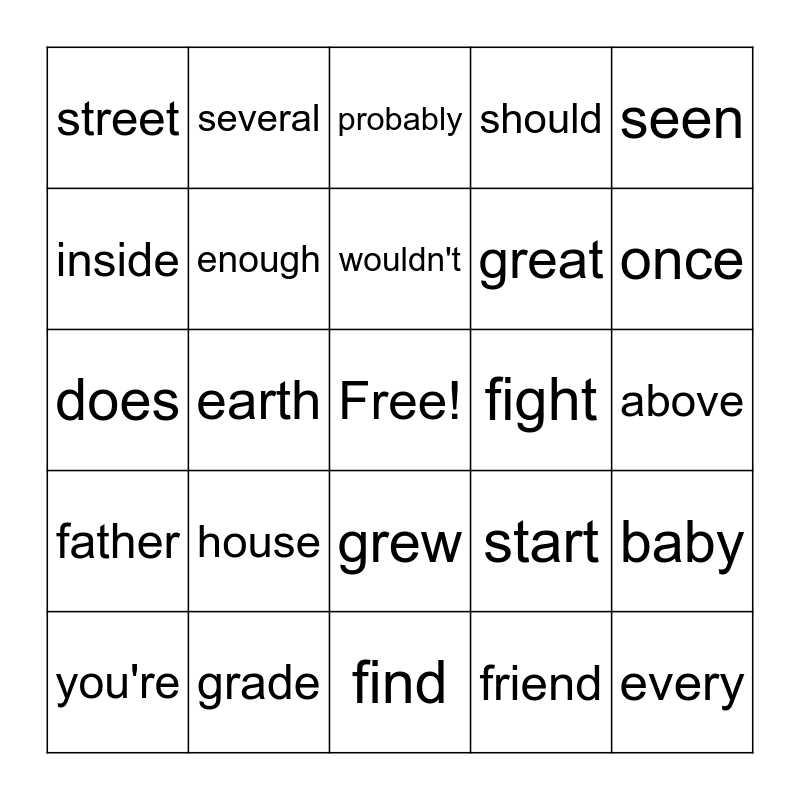 This bingo card has a free space and 34 words: together, friend, between, children, father, enough, seen, you're, several, everything, wouldn't, probably, through, against, fight, once, grade, does, house, start, grew, way, street, above, find, every, should, watch, great, inside, during, earth, baby and getting.