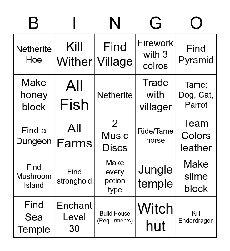 This bingo card has 33 words: Kill Enderdragon, All Wool, All Farms, Every wood type, Find Mushroom Island, All Fish, Find Pyramid, Find Sea Temple, Kill Wither, Diamond Gear, Netherite, Find Village, Kill Enemy 5 times, Name an animal, Ride/Tame horse, Tame: Dog, Cat, Parrot, Enchant Level 30, Find a Dungeon, Find stronghold, Jungle temple, Make every potion type, Consume a golden apple, Netherite Hoe, Team Colors leather, Build House (Requirments), 2 Music Discs, Firework with 3 colros, Trade with villager, Make honey block, Make slime block, Get A Trident, Witch hut and Build both golems.