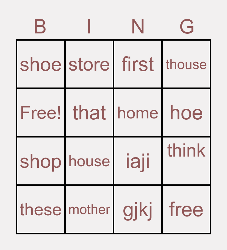 This bingo card has 16 words: mother, think, first, shoe, shop, store, iaji, gjkj, Free!, that, these, thouse, house, hoe, home and free.