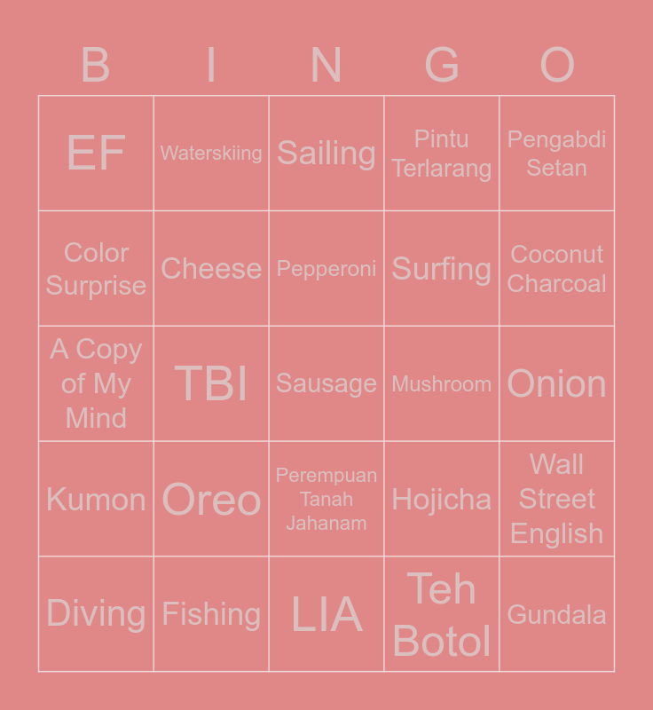 This bingo card has 25 words: Oreo, LIA, Pepperoni, Diving, Pengabdi Setan, EF, Color Surprise, Waterskiing, Mushroom, Perempuan Tanah Jahanam, Surfing, A Copy of My Mind, Hojicha, Wall Street English, Cheese, Gundala, Onion, Sailing, Coconut Charcoal, TBI, Sausage, Fishing, Kumon, Pintu Terlarang and Teh Botol.