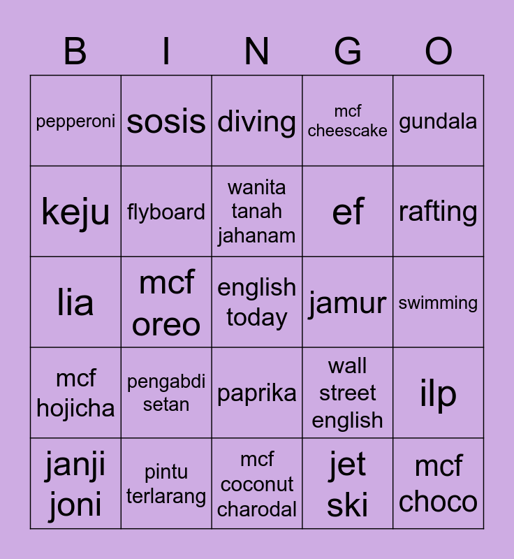 This bingo card has a free space and 24 words: pengabdi setan, pintu terlarang, wanita tanah jahanam, janji joni, gundala, pepperoni, keju, sosis, jamur, paprika, ef, lia, wall street english, ilp, flyboard, jet ski, swimming, diving, rafting, mcf oreo, mcf choco, mcf hojicha, mcf cheescake and mcf coconut charodal.