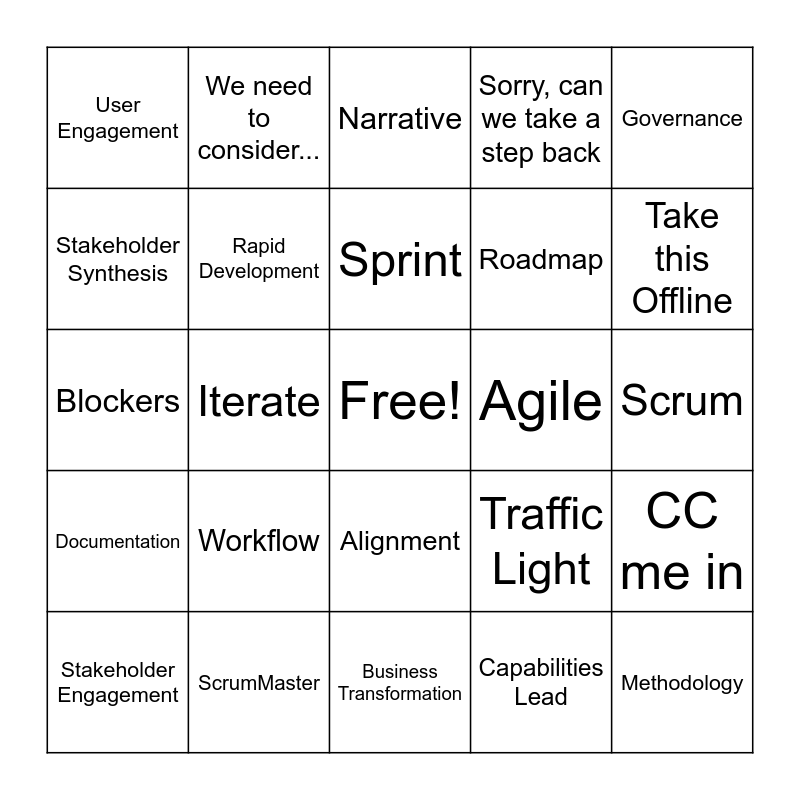 This bingo card has a free space and 29 words: Stakeholder Engagement, Initiative, Iterate, Lean, User Engagement, Narrative, Rapid Development, Workflow, Agile, ScrumMaster, Scrum, Methodology, Business Transformation, Capabilities Lead, Take this Offline, Let's Setup a Meeting, Alignment, Documentation, Governance, Blockers, Traffic Light, Stakeholder Synergy, Roadmap, Stakeholder Synthesis, Sorry, can we take a step back, We need to consider..., CC me in, Sprint and Backlog.