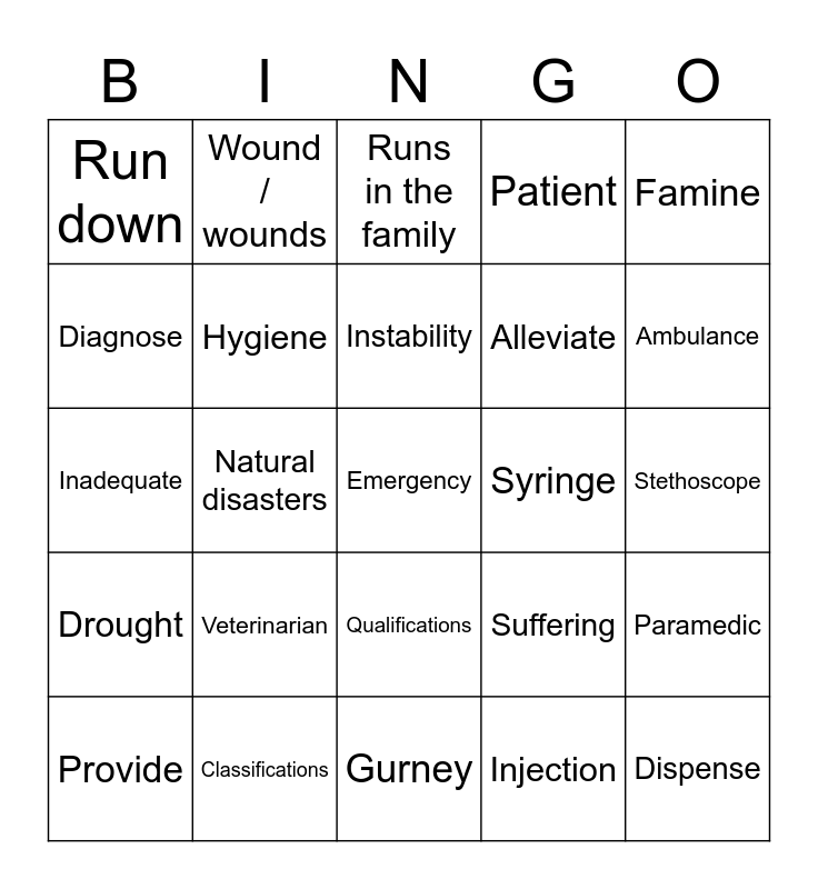 This bingo card has 40 words: Free!, Inadequate, Gratitude, Hygiene, Classifications, Qualifications, Instability, Insecure, Famine, Drought, Natural disasters, Patient, Emergency, Stethoscope, Syringe, Veterinarian, Sick as a dog, Run down, Under the weather, Runs in the family, Paramedic, Injection, Alleviate, Diagnose, Prescribe, Prescription, Medication / medications, Treatment, Dispense, Prevent, Promote, Provide, Restore, Suffering, Ambulance, Gurney, Casualty / casualties, Injury / injuries, Wound / wounds and Condition.