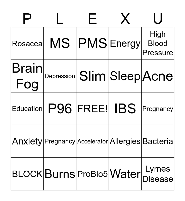 This bingo card has a free space and 24 words: Pregnancy, Burns, Slim, BLOCK, High Blood Pressure, Rosacea, Brain Fog, MS, IBS, Accelerator, Sleep, Education, Allergies, Bacteria, Depression, Water, Pregnancy, PMS, Acne, P96, Lymes Disease, Anxiety, Energy and ProBio5.