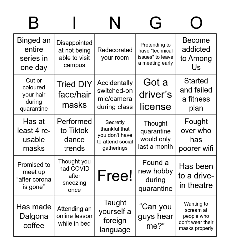 This bingo card has 26 words: Free!, “Can you guys hear me?”, Accidentally switched-on mic/camera during class, Attending an online lesson while in bed, Become addicted to Among Us, Binged an entire series in one day, Cut or coloured your hair during quarantine, Disappointed at not being able to visit campus, Fought over who has poorer wifi, Found a new hobby during quarantine, Got a driver’s license, Has at least 4 re-usable masks, Has been to a drive-in theatre, Has made Dalgona coffee, Performed to Tiktok dance trends, Plans to join at least three MDX clubs, Pretending to have "technical issues" to leave a meeting early, Promised to meet up “after corona is gone”, Redecorated your room, Secretly thankful that you don't have to attend social gatherings, Started and failed a fitness plan, Taught yourself a foreign language, Thought quarantine would only last a month, Thought you had COVID after sneezing once, Tried DIY face/hair masks and Wanting to scream at people who don't wear their masks properly.