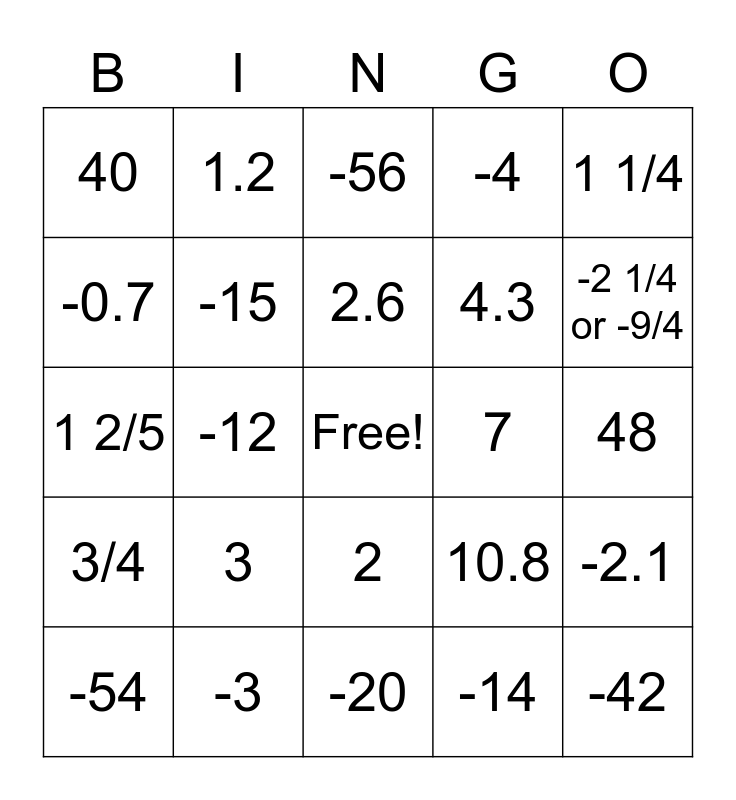 This bingo card has a free space and 29 words: -54, 15, -12, 36, 40, -56, -15, 3, 7, -3, 48, -42, -20, -14, -2 1/4 or -9/4, -1 3/5, 2, 3/4, 1 1/4, 1 2/5, 10.8, 4.2, 4.3, -0.7, -4, 1.2, -2.1, 2.6 and -9.62.