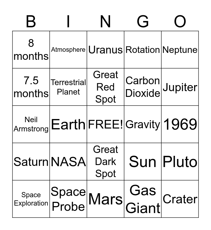 This bingo card has a free space and 24 words: NASA, Space Probe, Great Red Spot, Space Exploration, Neptune, 8 months, 7.5 months, Atmosphere, Gravity, Great Dark Spot, Carbon Dioxide, Neil Armstrong, Sun, Pluto, Terrestrial Planet, Gas Giant, 1969, Uranus, Jupiter, Earth, Crater, Saturn, Rotation and Mars.