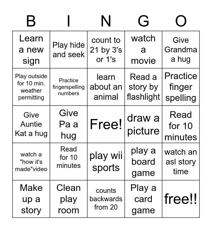 This bingo card has a free space and 24 words: Read for 10 minutes, Clean play room, learn about an animal, Make up a story, Give Grandma a hug, Learn a new sign, Play outside for 10 min. weather permitting, Play hide and seek, draw a picture, play wii sports, Read a story by flashlight, Give Auntie Kat a hug, play a board game, watch an asl story time, Practice fingerspelling numbers, Play a card game, Read for 10 minutes, count to 21 by 3's or 1's, Practice finger spelling, Give Pa a hug, free!!, watch a "how it's made"video, watch a movie and counts backwards from 20.