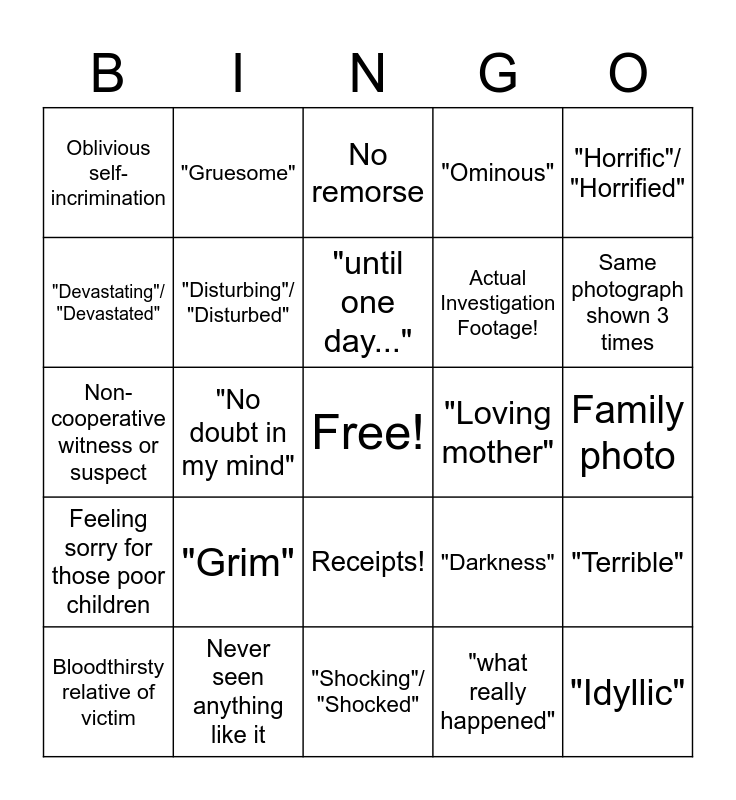 This bingo card has a free space and 48 words: "Heinous", "Idyllic", "Peaceful", "Shocking"/ "Shocked", "Grim", "Violent"/ "Violence", "Gruesome", "Harrowing", "Devastating"/ "Devastated", "Terrifying"/ "Terrified", "Disturbing"/ "Disturbed", "Ominous", "Terrible", "Darkness", "Chilling", "but then...", "until one day...", "Loving mother", "Ex-Boyfriend", "Horrific"/ "Horrified", "No doubt in my mind", "what really happened", Oblivious self-incrimination, Actual Investigation Footage!, Actual Investigation Photo!, Same photograph shown 3 times, Bloodthirsty relative of victim, Police interrogation without lawyer, Receipts!, Feeling sorry for those poor children, Christians!, Would never hurt anybody, A robbery gone wrong, Life insurance, Never seen anything like it, Crime scene tape, Showing cassette tape while playing audio recording, Family photo, Only one question left to answer, Stunned investigators, Someone that loved life, No history of violence, No remorse, Blood spatter, Non-cooperative witness or suspect, RKO, Spoiler mugshot! and Spoiler prison interview!.