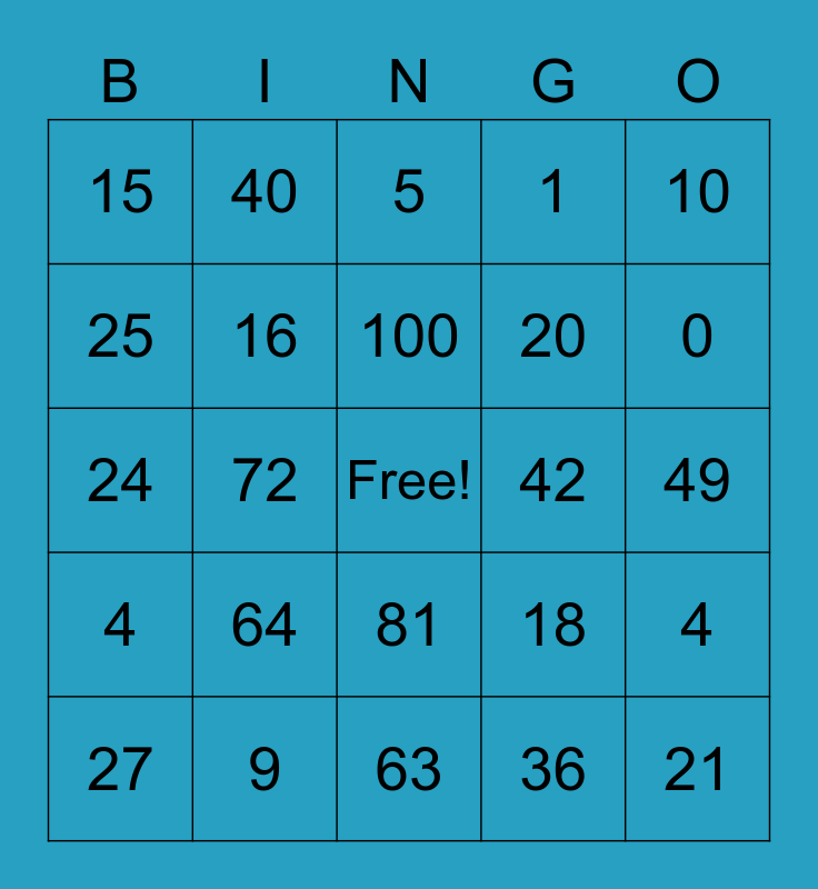 This bingo card has a free space and 24 words: 64, 9, 100, 27, 10, 15, 25, 40, 42, 81, 20, 24, 18, 4, 16, 36, 49, 5, 0, 72, 21, 4, 1 and 63.