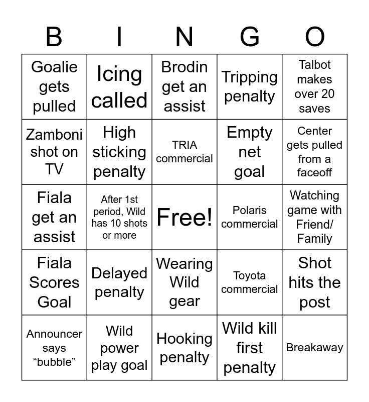This bingo card has a free space and 48 words: Puck goes out of play, Breakaway, Net is knocked loose, Hooking penalty, Delayed penalty, Stick breaks, Icing called, Video goal review, Zamboni shot on TV, Offside, High sticking penalty, Tripping penalty, Shot hits the post, Toyota commercial, Xcel Energy commercial, PetSmart commercial, TRIA commercial, Polaris commercial, Defenseman scores, Talbot makes over 20 saves, After 1st period, Wild has 10 shots or more, Wild kill first penalty, Goalie gets pulled, Empty net goal, Penalty for too many men on the ice, Center gets pulled from a faceoff, Announcer says “bubble”, Drinking your favorite drink during the game, Wearing Wild gear, Fiala Scores Goal, Kirill Scores Goal, Bonino Scores Goal, Dumba Scores Goal, Parise Scores Goal, Wild power play goal, Announcer talks about new division alignments, Away team calls timeout, Watching game with Friend/ Family, Listening to game on radio, Suter get an assist, Spurgeon get an assist, Marcus Johannson get an assist, Brodin get an assist, Kirill get an assist, Fiala get an assist, Close up of the bench, Watch intermission player interview and Wild win.