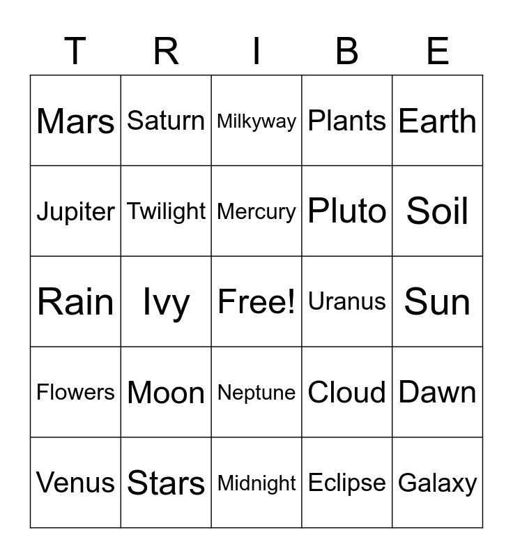 This bingo card has a free space and 24 words: Moon, Stars, Mercury, Venus, Earth, Mars, Jupiter, Saturn, Uranus, Neptune, Pluto, Rain, Cloud, Dawn, Twilight, Eclipse, Sun, Milkyway, Soil, Ivy, Galaxy, Flowers, Plants and Midnight.