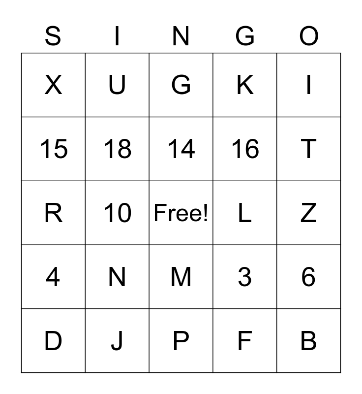 This bingo card has a free space and 45 words: A, B, C, D, E, F, G, H, I, J, K, L, M, N, O, P, Q, R, S, T, U, V, W, X, Y, Z, 1, 2, 3, 4, 5, 6, 7, 8, 9, 10, 11, 12, 13, 14, 15, 16, 17, 18 and 19.