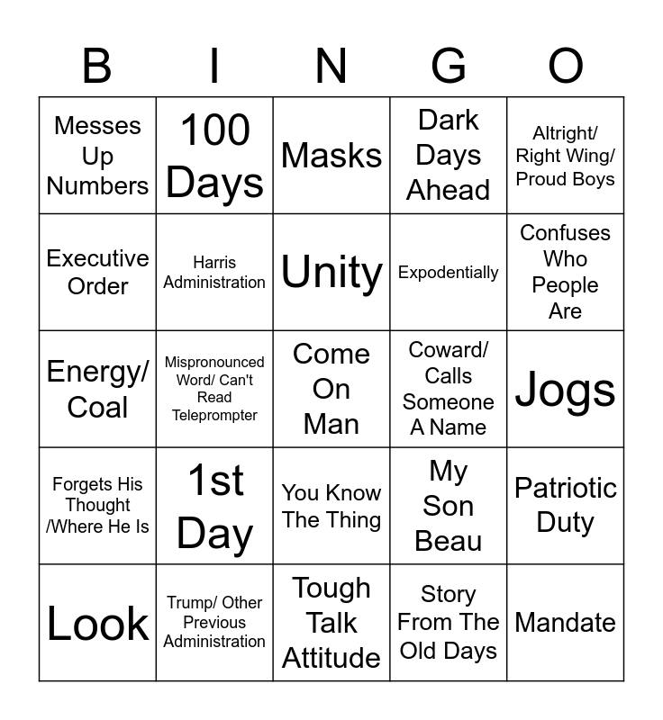 This bingo card has a free space and 24 words: 1st Day, Trump/ Other Previous Administration, Unity, Look, Altright/ Right Wing/ Proud Boys, Messes Up Numbers, Executive Order, 100 Days, Coward/ Calls Someone A Name, You Know The Thing, Expodentially, Energy/ Coal, My Son Beau, Patriotic Duty, Harris Administration, Story From The Old Days, Jogs, Masks, Confuses Who People Are, Mispronounced Word/ Can't Read Teleprompter, Mandate, Forgets His Thought /Where He Is, Dark Days Ahead and Tough Talk Attitude.