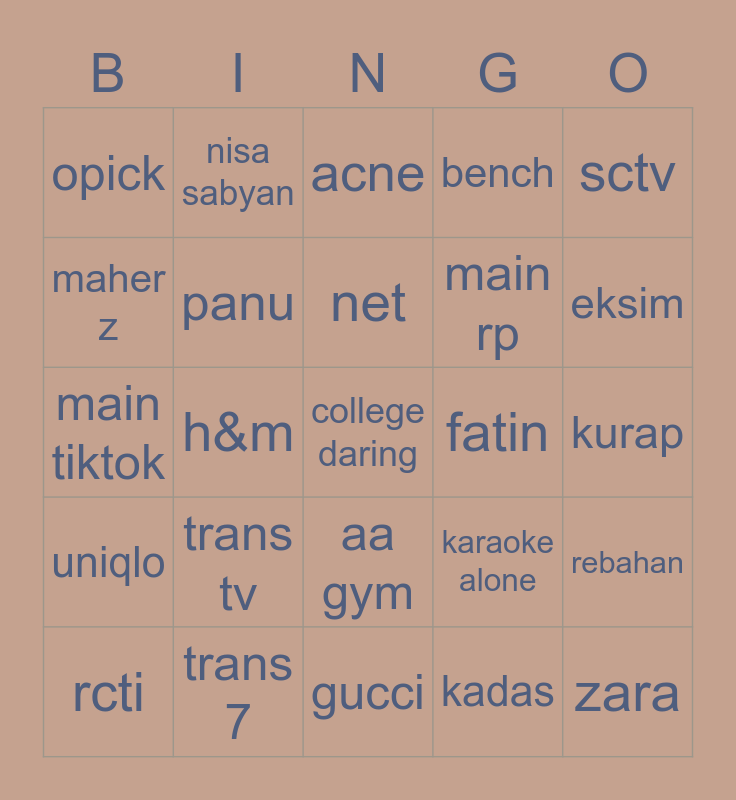 This bingo card has a free space and 24 words: trans tv, trans 7, net, rcti, sctv, opick, maher z, nisa sabyan, fatin, aa gym, main rp, main tiktok, karaoke alone, rebahan, panu, kadas, kurap, acne, eksim, h&m, zara, uniqlo, bench and gucci.