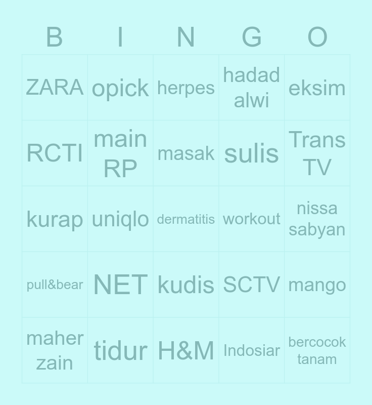 This bingo card has 25 words: NET, H&M, masak, maher zain, eksim, ZARA, RCTI, opick, workout, kudis, sulis, kurap, SCTV, mango, main RP, bercocok tanam, nissa sabyan, herpes, Trans TV, uniqlo, dermatitis, tidur, pull&bear, hadad alwi and Indosiar.