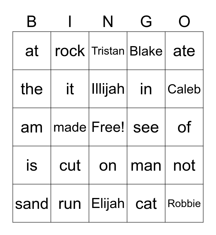 This bingo card has a free space and 24 words: cut, run, Illijah, sand, ate, at, the, rock, see, on, in, am, man, not, it, cat, of, Tristan, Caleb, made, Robbie, is, Blake and Elijah.