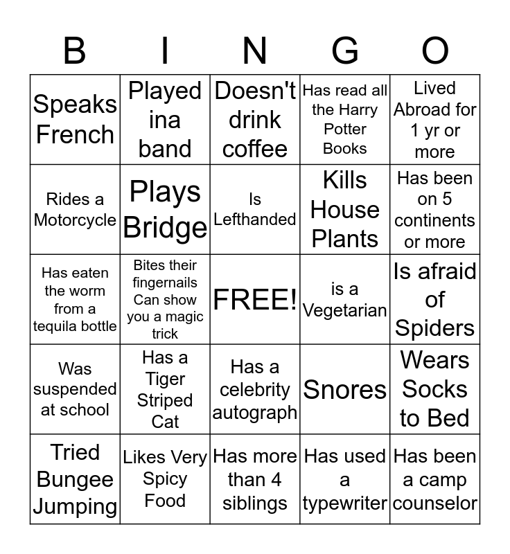 This bingo card has a free space and 24 words: Has a Tiger Striped Cat, Likes Very Spicy Food, Is Lefthanded, Tried Bungee Jumping, Lived Abroad for 1 yr or more, Speaks French, Rides a Motorcycle, Played ina band, is a Vegetarian, Has a celebrity autograph, Kills House Plants, Has eaten the worm from a tequila bottle, Snores, Wears Socks to Bed, Plays Bridge, Has used a typewriter, Is afraid of Spiders, Doesn't drink coffee, Has been on 5 continents or more, Bites their fingernails Can show you a magic trick, Has been a camp counselor, Was suspended at school, Has read all the Harry Potter Books and Has more than 4 siblings.