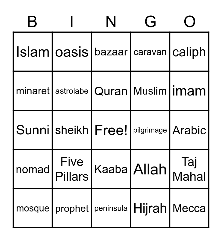 This bingo card has a free space and 24 words: Five Pillars, prophet, Quran, mosque, caliph, Islam, minaret, oasis, pilgrimage, Kaaba, Muslim, Sunni, Allah, Taj Mahal, astrolabe, Hijrah, Arabic, bazaar, imam, sheikh, Mecca, nomad, caravan and peninsula.