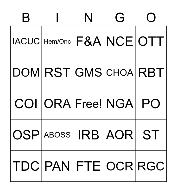 This bingo card has a free space and 24 words: ABOSS, PAN, GMS, TDC, OTT, IACUC, DOM, Hem/Onc, NGA, IRB, CHOA, COI, AOR, ST, RST, OCR, PO, F&A, RBT, ORA, RGC, OSP, NCE and FTE.