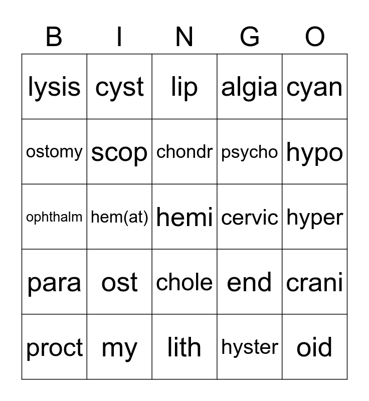 This bingo card has 25 words: para, my, hemi, hyster, cyan, lysis, cyst, lip, cervic, crani, ostomy, scop, lith, end, hypo, proct, hem(at), chondr, psycho, hyper, ophthalm, ost, chole, algia and oid.