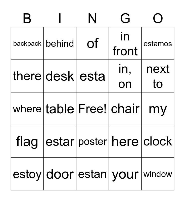 This bingo card has a free space and 25 words: estar, estan, esta, estoy, estamos, backpack, there, behind, chair, poster, in, on, where, here, clock, desk, on top of, my, of, next to, table, window, door, flag, in front and your.