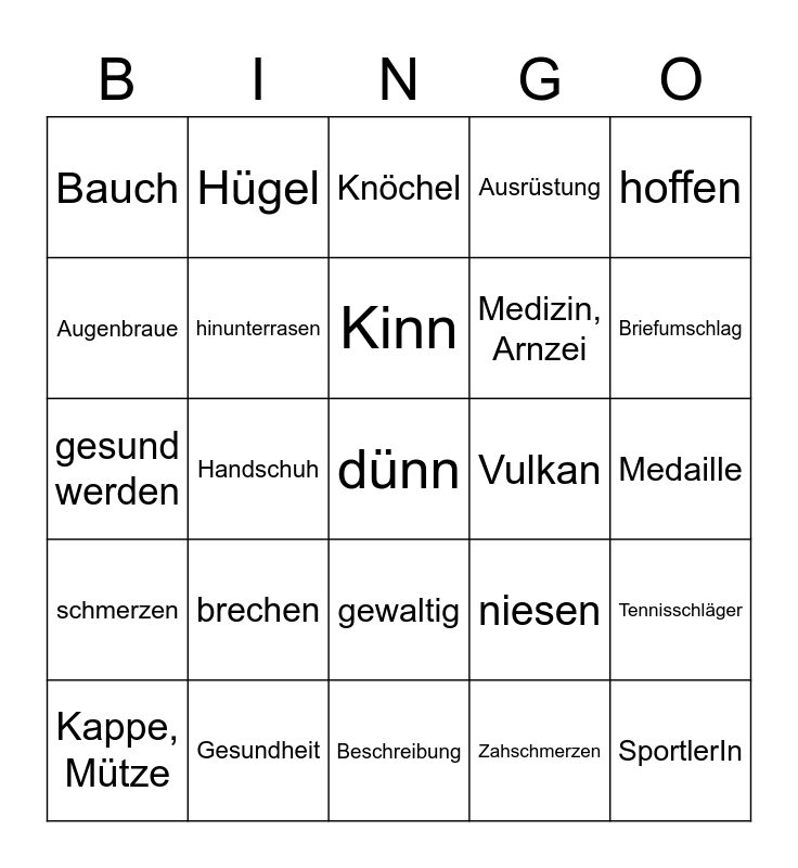 This bingo card has 30 words: Gesundheit, trainieren, Handschuh, Ellbogenschoner, Bauch, Knöchel, hinunterrasen, gewaltig, Vulkan, Beschreibung, Medaille, dünn, Zahschmerzen, SportlerIn, Briefumschlag, GründerIn, niesen, schmerzen, brechen, hoffen, gesund werden, furchtbar, schrecklich, Hügel, Medizin, Arnzei, Augenbraue, Ausrüstung, Tennisschläger, Kappe, Mütze, Kinn and Grippe.