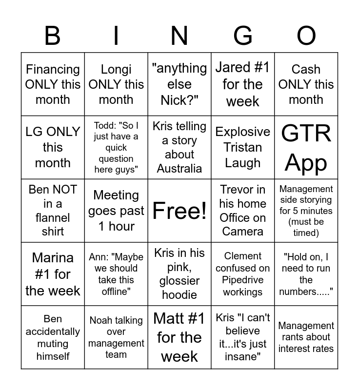 This bingo card has a free space and 24 words: Ann: "Maybe we should take this offline", Noah talking over management team, Kris telling a story about Australia, Ben accidentally muting himself, Cash ONLY this month, Financing ONLY this month, LG ONLY this month, Longi ONLY this month, Trevor in his home Office on Camera, Kris in his pink, glossier hoodie, Explosive Tristan Laugh, Ben NOT in a flannel shirt, Clement confused on Pipedrive workings, "Hold on, I need to run the numbers.....", Todd: "So I just have a quick question here guys", Kris "I can't believe it...it's just insane", Management side storying for 5 minutes (must be timed), "anything else Nick?", GTR App, Meeting goes past 1 hour, Management rants about interest rates, Marina #1 for the week, Jared #1 for the week and Matt #1 for the week.