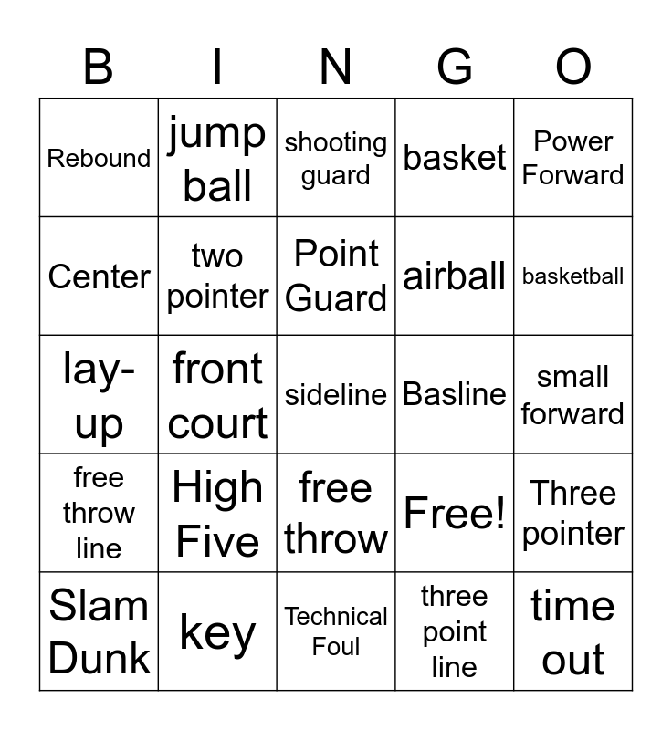 This bingo card has 25 words: High Five, Technical Foul, Point Guard, Slam Dunk, Power Forward, Rebound, Center, jump ball, Basline, free throw, airball, lay-up, Free!, Three pointer, two pointer, time out, small forward, shooting guard, basketball, front court, sideline, key, free throw line, basket and three point line.