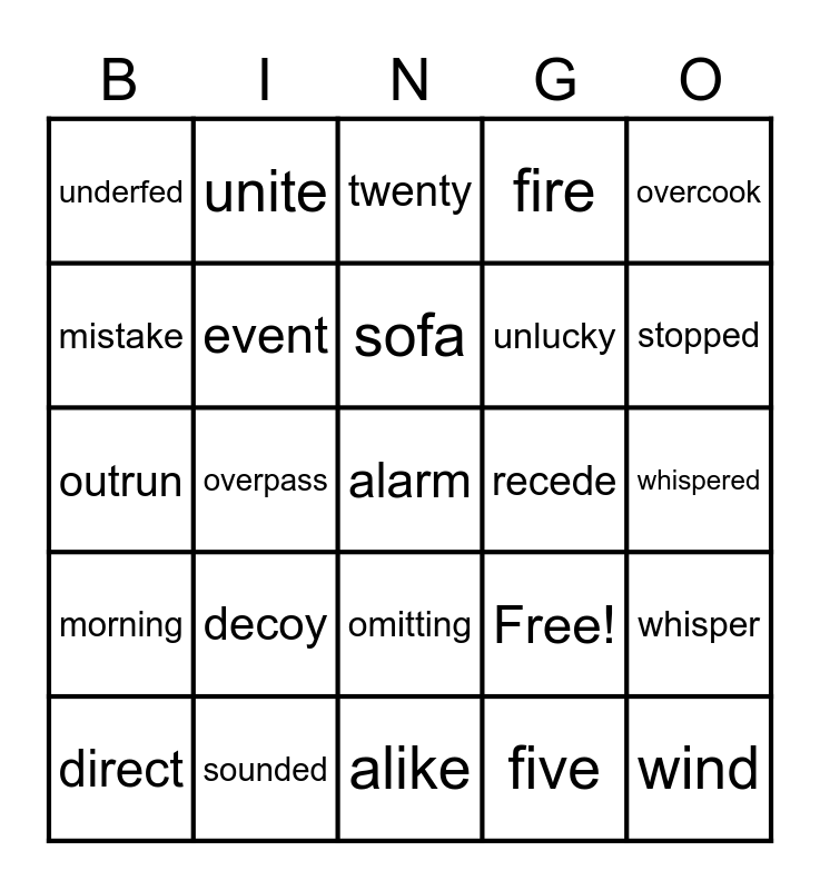 This bingo card has 25 words: decoy, alike, sofa, direct, overcook, underfed, mistake, unite, recede, omitting, unlucky, outrun, Free!, whisper, event, wind, whispered, twenty, stopped, overpass, alarm, sounded, morning, fire and five.