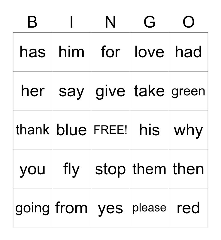 This bingo card has a free space and 24 words: fly, from, give, going, had, has, her, him, his, stop, take, thank, them, then, say, please, why, for, green, blue, red, you, love and yes.