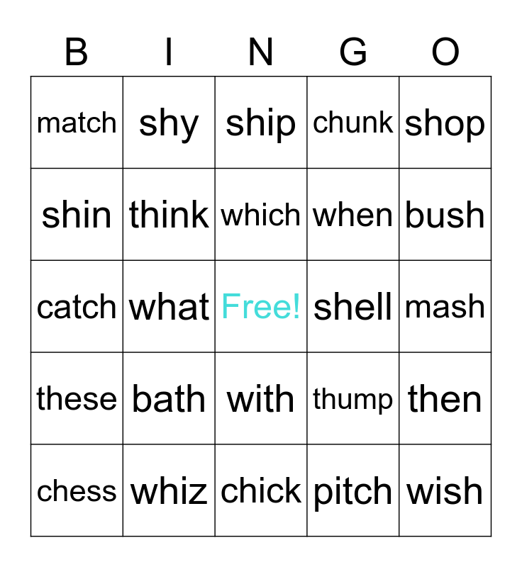 This bingo card has a free space and 29 words: chess, thick, what, chips, match, ship, think, bath, shell, whiz, mash, wish, chick, pitch, bush, thank, with, these, shop, catch, thump, why, when, shin, chunk, shy, then, which and batch.