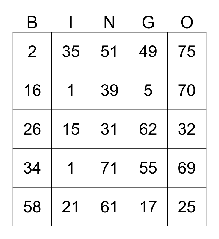 This bingo card has a free space and 24 words: 1, 21, 39, 58, 75, 2, 16, 35, 62, 71, 5, 26, 55, 69, 1, 17, 32, 51, 70, 15, 25, 34, 49 and 61.