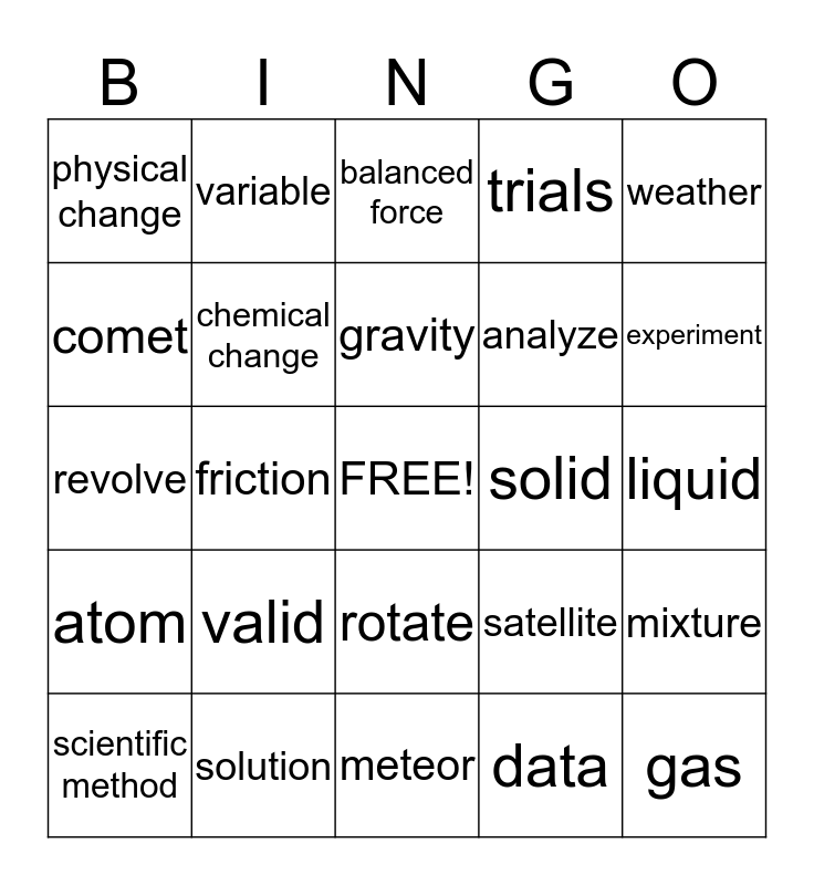This bingo card has a free space and 24 words: valid, solution, gravity, scientific method, weather, physical change, comet, variable, solid, rotate, analyze, revolve, satellite, mixture, chemical change, data, liquid, balanced force, experiment, friction, gas, atom, trials and meteor.