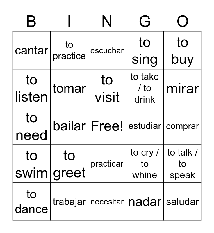 This bingo card has a free space and 30 words: trabajar, visitar, bailar, hablar, cantar, escuchar, tomar, practicar, estudiar, necesitar, comprar, saludar, nadar, llorar, mirar, to look at / to watch, to cry / to whine, to swim, to greet, to buy, to need, to study, to practice, to take / to drink, to listen, to sing, to talk / to speak, to dance, to visit and to work.