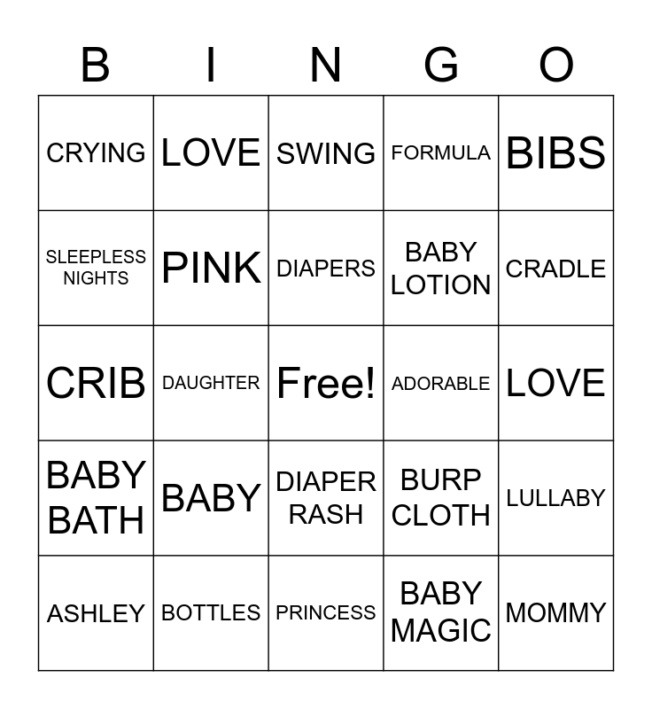This bingo card has a free space and 24 words: BABY, BOTTLES, DIAPERS, ASHLEY, BIBS, CRYING, SLEEPLESS NIGHTS, LOVE, ADORABLE, DIAPER RASH, BABY LOTION, CRIB, BURP CLOTH, LULLABY, PINK, BABY MAGIC, LOVE, SWING, CRADLE, DAUGHTER, MOMMY, BABY BATH, FORMULA and PRINCESS.