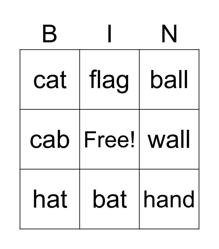 This bingo card has a free space and 18 words: ant, bag, ball, cat, car, cab, cast, flag, bat, glass, ham, hand, jam, wall, hat, map, mat and crab.