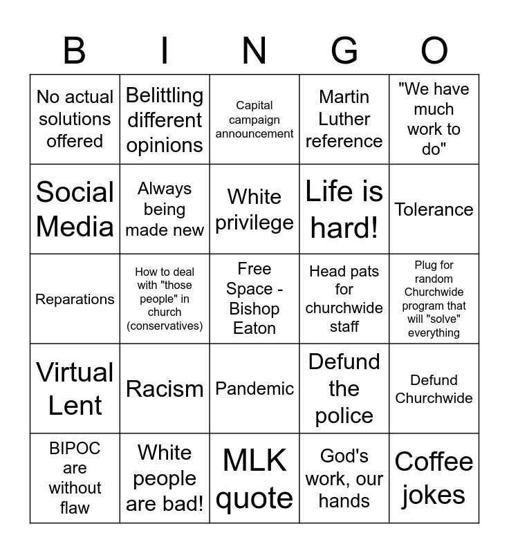 This bingo card has a free space and 24 words: Racism, White people are bad!, White privilege, BIPOC are without flaw, "We have much work to do", No actual solutions offered, Social Media, Belittling different opinions, Head pats for churchwide staff, Pandemic, Life is hard!, Reparations, Defund the police, Defund Churchwide, Always being made new, God's work, our hands, Plug for random Churchwide program that will "solve" everything, Capital campaign announcement, Tolerance, How to deal with "those people" in church (conservatives), Coffee jokes, Virtual Lent, Martin Luther reference and MLK quote.