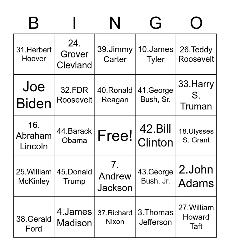 This bingo card has a free space and 29 words: 28.Woodrow Wilson, 4.James Madison, 39.Jimmy Carter, 34.Dwight D. Eisenhower, 26.Teddy Roosevelt, 31.Herbert Hoover, 32.FDR Roosevelt, 40.Ronald Reagan, 42.Bill Clinton, 2.John Adams, 38.Gerald Ford, 44.Barack Obama, 3.Thomas Jefferson, 27.William Howard Taft, 16. Abraham Lincoln, 1.George Washington, 37.Richard Nixon, 43.George Bush, Jr., 33.Harry S. Truman, 25.William McKinley, 45.Donald Trump, 35.JFK Kennedy, 41.George Bush, Sr., 18.Ulysses S. Grant, Joe Biden, 24. Grover Clevland, 7. Andrew Jackson, 10.James Tyler and 36.Lyndon Johnson.
