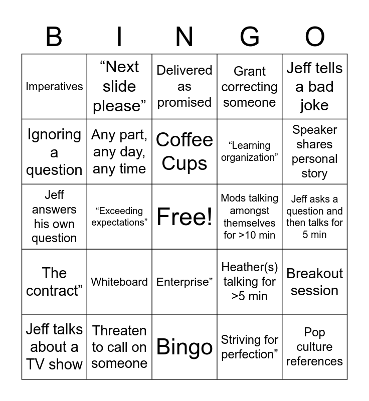 This bingo card has a free space and 31 words: Bingo, MICHELLE SAYS SOMETHING, “Exceeding expectations”, Pillars of excellence, Imperatives, Delivered as promised, Any part, any day, any time, Heather(s) talking for >5 min, Mods talking amongst themselves for >10 min, Striving for perfection”, Jeff asks a question and then talks for 5 min, Pop culture references, “Check in”, Sports analogy, Speaker shares personal story, Over sharing personal story, Breakout session, Whiteboard, The contract”, Enterprise”, Jeff tells a bad joke, Jeff mentions UT football, Jeff talks about a TV show, “Next slide please”, “Learning organization”, Ignoring a question, Grant correcting someone, Jeff answers his own question, Threaten to call on someone, Coffee Cups and Someone disagrees with Whitney or Grant.