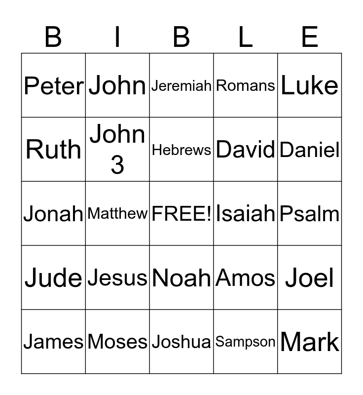 This bingo card has a free space and 24 words: Jesus, Moses, Hebrews, James, Luke, Peter, Ruth, John, Isaiah, Noah, David, Jonah, Amos, Joel, John 3, Sampson, Psalm, Jeremiah, Daniel, Matthew, Mark, Jude, Romans and Joshua.
