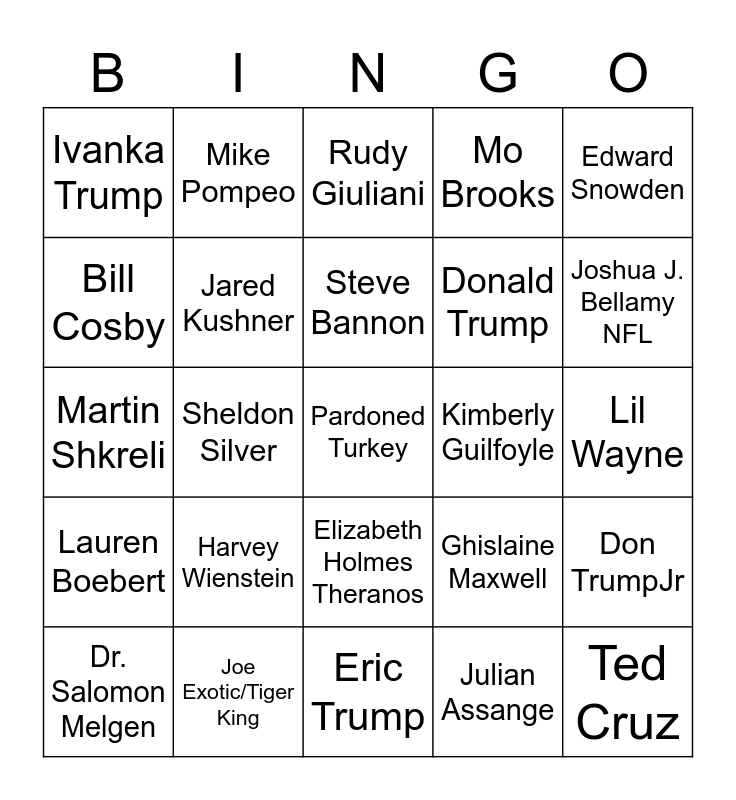 This bingo card has a free space and 24 words: Harvey Wienstein, Joe Exotic/Tiger King, Steve Bannon, Dr. Salomon Melgen, Edward Snowden, Ivanka Trump, Bill Cosby, Mike Pompeo, Kimberly Guilfoyle, Elizabeth Holmes Theranos, Donald Trump, Martin Shkreli, Ghislaine Maxwell, Don TrumpJr, Jared Kushner, Julian Assange, Lil Wayne, Rudy Giuliani, Joshua J. Bellamy NFL, Sheldon Silver, Ted Cruz, Lauren Boebert, Mo Brooks and Eric Trump.