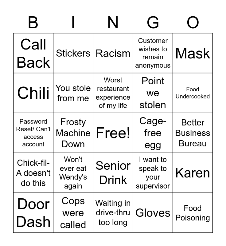 This bingo card has a free space and 24 words: Won't ever eat Wendy's again, Cops were called, Worst restaurant experience of my life, Door Dash, Mask, Call Back, Chili, Stickers, Cage-free egg, Senior Drink, Point we stolen, Password Reset/ Can't access account, I want to speak to your supervisor, Karen, You stole from me, Gloves, Better Business Bureau, Racism, Food Undercooked, Frosty Machine Down, Food Poisoning, Chick-fil-A doesn't do this, Customer wishes to remain anonymous and Waiting in drive-thru too long.