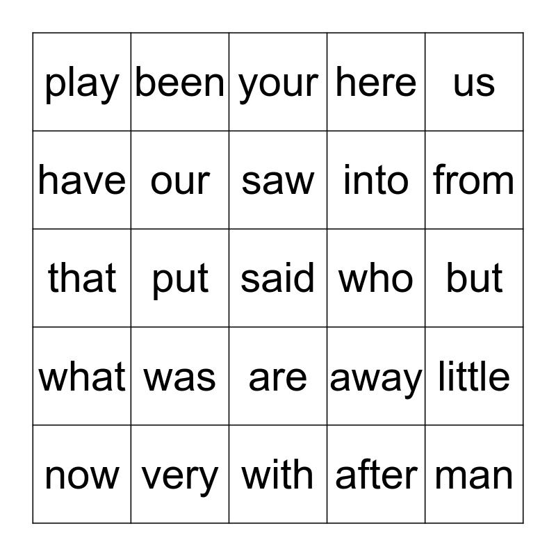 This bingo card has a free space and 24 words: was, very, saw, now, us, play, have, been, who, are, into, that, away, little, our, after, but, your, from, put, man, what, here and with.