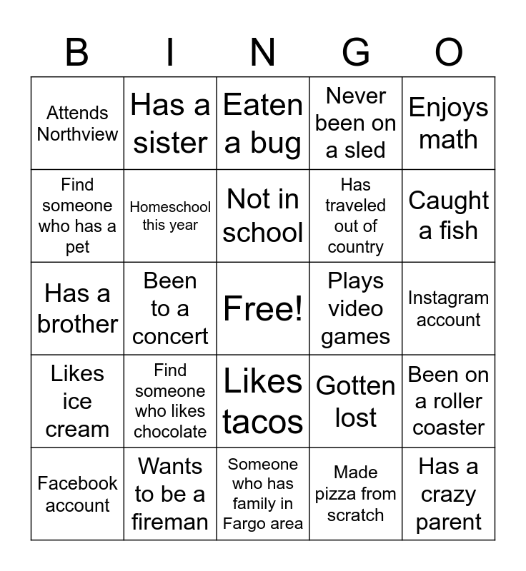 This bingo card has a free space and 24 words: Find someone who likes chocolate, Wants to be a fireman, Not in school, Facebook account, Enjoys math, Attends Northview, Find someone who has a pet, Has a sister, Plays video games, Likes tacos, Has traveled out of country, Has a brother, Gotten lost, Been on a roller coaster, Homeschool this year, Made pizza from scratch, Instagram account, Eaten a bug, Caught a fish, Been to a concert, Has a crazy parent, Likes ice cream, Never been on a sled and Someone who has family in Fargo area.