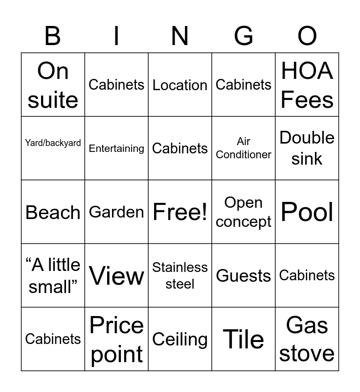 This bingo card has a free space and 29 words: Cabinets, Restaurants, Garden, Nice pool, On suite, Location, Entertaining, View, Open concept, Price point, Pool, Gas stove, Ceiling, Tile, Double sink, Renovations, Stainless steel, “A little small”, HOA Fees, Beach, Guests, Great Breeze, Air Conditioner, Yard/backyard, Cabinets, Cabinets, Cabinets, Cabinets and Cabinets.