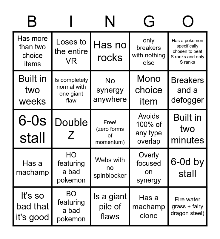 This bingo card has a free space and 24 words: It's so bad that it's good, HO featuring a bad pokemon, No synergy anywhere, Has a machamp clone, Has a pokemon specifically chosen to beat S ranks and only S ranks, Has more than two choice items, Loses to the entire VR, Has no rocks, Avoids 100% of any type overlap, Built in two minutes, 6-0s stall, Is completely normal with one giant flaw, Overly focused on synergy, 6-0d by stall, Built in two weeks, BO featuring a bad pokemon, Is a giant pile of flaws, only breakers with nothing else, Breakers and a defogger, Has a machamp, Double Z, Webs with no spinblocker, Mono choice item and Fire water grass + fairy dragon steel).