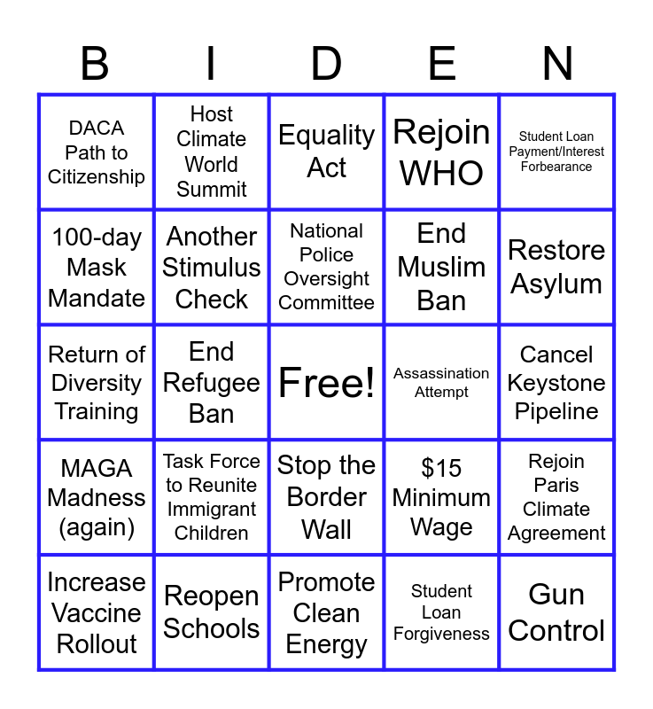 This bingo card has a free space and 24 words: Task Force to Reunite Immigrant Children, Reopen Schools, National Police Oversight Committee, Increase Vaccine Rollout, Student Loan Payment/Interest Forbearance, DACA Path to Citizenship, 100-day Mask Mandate, Host Climate World Summit, Assassination Attempt, Stop the Border Wall, End Muslim Ban, Return of Diversity Training, $15 Minimum Wage, Rejoin Paris Climate Agreement, Another Stimulus Check, Student Loan Forgiveness, Cancel Keystone Pipeline, Equality Act, Restore Asylum, End Refugee Ban, Gun Control, MAGA Madness (again), Rejoin WHO and Promote Clean Energy.