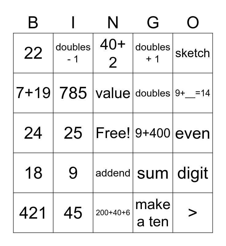 This bingo card has a free space and 29 words: 421, 96, 25, 999, 22, 40+ 2, 785, 9, 9+400, 45, even, >, 200+40+6, make a ten, 9+__=14, odd, addend, 18, sketch, 24, sum, <, doubles, 7+19, doubles + 1, doubles - 1, digit, value and 50.
