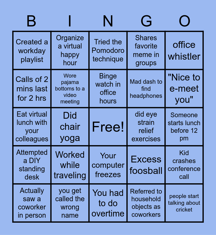 This bingo card has a free space and 29 words: Actually saw a coworker in person, Said "lol" and meant it, Did chair yoga, Took a typing speed-test for fun, Created a workday playlist, Tried the Pomodoro technique, Wore pajama bottoms to a video meeting, Worked while traveling, did eye strain relief exercises, you get called the wrong name, Someone starts lunch before 12 pm, people start talking about cricket, You had to do overtime, Referred to household objects as coworkers, "Nice to e-meet you", Desk that now doubles as a kitchen table, Your computer freezes, Attempted a DIY standing desk, office whistler, Eat virtual lunch with your colleagues, Excess foosball, Picked up a new skill or hobby, Mad dash to find headphones, Calls of 2 mins last for 2 hrs, Shares favorite meme in groups, Organize a virtual happy hour, Kid crashes conference call, Binge watch in office hours and Catch someone talking to themselves..
